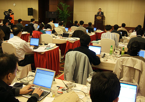 중국 베이징 메리어트호텔 2층에 마련된 한국 프레스센터에서 천영우 본부장은 내외신 기자들에게 "오늘 제가 만나본 4개국 수석대표들의 일반적인 판단은 말씀드린대로 어느 때보다 상황이 어렵다는 생각을 다 하고 있는 것 같다"고 회담 전망이 결코 밝지 않다는 점을 강조했다.