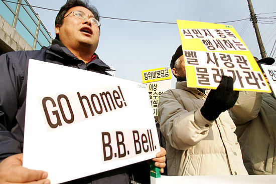 ▲11일 오전 10시 시민사회단체들은 한미연합사 입구에서 지난 8일 버웰 벨 사령관이 평택기지이전에 차질이 생기면 "싸우겠다"고 한 발언을 두고 규탄 기자회견을 열었다. [사진-통일뉴스 김주영 기자]▲ 한미연합사 입구인 용산 미군기지 5번 게이트 인근 다리 위로 미군들이 지나가며 기자회견을 바라보고 있다.(사진 오른쪽 위)[사진-통일뉴스 김주영 기자]▲ 참가자들은 기자회견을 마치고 벨 사령관에서 보내는 항의서한을 접수시키려 했으나 경찰이 이를 막아나서고 있다. [사진-통일뉴스 김주영 기자]▲ [사진-통일뉴스 김주영 기자]▲ [사진-통일뉴스 김주영 기자]▲ [사진-통일뉴스 김주영 기자]▲ [사진-통일뉴스 김주영 기자]
