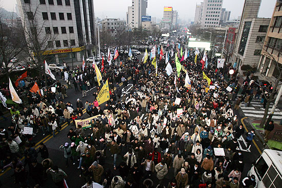 이들은 10여분간 퇴계로를 따라 이동하다가, 본대회가 끝나고 대학로에서부터 걸어서 이동해오던 농민, 사회단체 회원 등 4천여명과 퇴계로 4가 사거리에서 합류했다.
