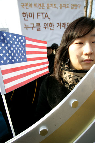 ▲ '협상장을 향해 날아오른 풍선들' 한미FTA협상 나흘째를 맞은 16일 오전, 협상장 입구에서 농성을 벌이고 있는 민주노동당 국회의원들이 협상장을 향해 날인 '한미FTA저지 풍선' 들이 협상장 위로 날아오르고 있다. [사진-통일뉴스 김주영 기자]▲ 이날 민주노동당 의원들의 노숙 농성장에는 김태홍 의원, 임종인 의원 등 열린우리당 국회의원들이 함께 했다.[사진-통일뉴스 김주영 기자]▲ '한미FTA저지 풍선'을 날리는 민주노동당 국회의원들. [사진-통일뉴스 김주영 기자]▲ '한미FTA저지 풍선날리기'퍼포먼스를 마친 민주노동당 의원들이 단식 나흘째를 맞아 기자회견을 열열고 있다. [사진-통일뉴스 김주영 기자]▲ 협상장 앞에서 단식 노숙농성 나흘째를 맞은 의원들 뒤로 물과, 신발, 책 등이 어지럽게 놓여 있다. [사진-통일뉴스 김주영 기자]▲ 민주노동당 심상정 국회의원이 노숙 단식농성 나흘째를 맞은 의원들의 입장을 전하고 있다.[사진-통일뉴스 김주영 기자]▲ 한편, 18일 오전 10시 30분경, '한미FTA범국민운동본부'는 소속 단체 상근자들을 중심으로 한 '한미FTA저지 범국민서명운동 출정식'을 열었다. [사진-통일뉴스 김주영 기자]▲ "누구를 위한 거래?"[사진-통일뉴스 김주영 기자]▲ [사진-통일뉴스 김주영 기자]▲ [사진-통일뉴스 김주영 기자]▲ 선전전을 나가기 앞서 피켓을 챙기는 상근자들. [사진-통일뉴스 김주영 기자]