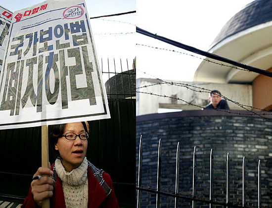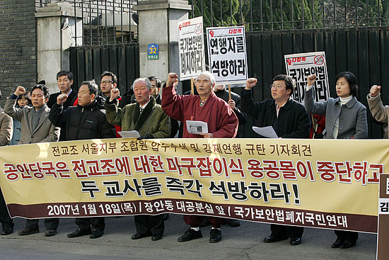 18일 오후 2시 50분 서울 동대문구 장안동 대공분실 앞에서 전교조 등 시민사회단체 회원 40여명이 모인 가운데 '국가보안법폐지국민연대(공동대표 오종렬)'가 '전교조 서울지부 조합원 압부수색 및 강제연행 규탄 기자회견'을 열었다.