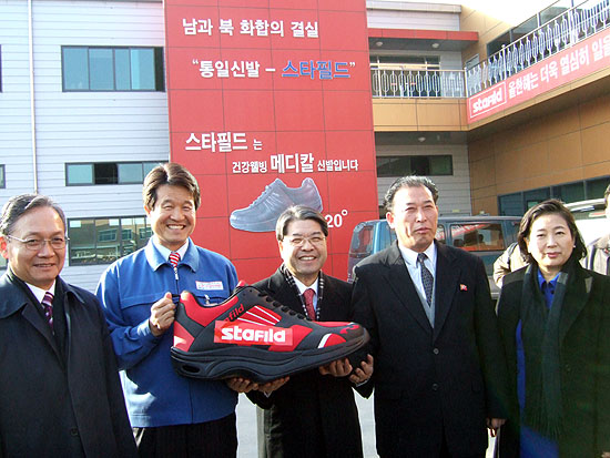 공장을 들어서자 ‘남과 북 화합의 결실 통일신발 - 스타필드’라는 커다란 간판이 눈에 들어온다.