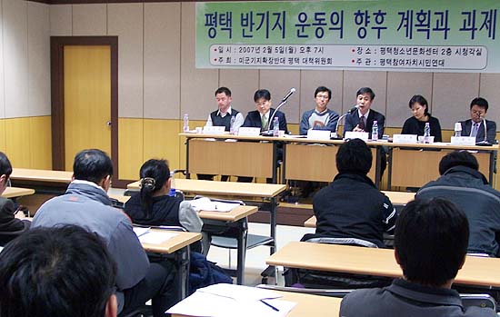 5 일 오후 7시 평택청소년문화센터 2층 시청각실에서 평택대책위(상임대표 이은우)가 '평택 반기지 운동의 향후 계획과 과제'를 주제로 토론회를 열었다.