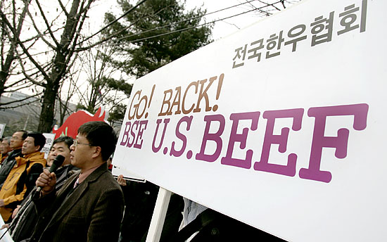 지난 7,8일 수의과학검역원에서 열린 한미 쇠고기 기술협의가 한미 양측의 의견을 좁히지 못하고 끝난 가운데 9일 오전 11시 서울 중앙정부청사 앞에서 시민사회단체들이 기자회견을 열고 기술협의에서 농림부측의 검역완화 제안 철회를 요구했다.[사진-통일뉴스 김주영 기자]