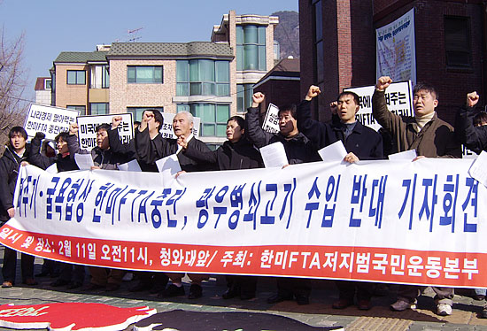 지난 10일, '한미FTA저지 범국민운동본부(범국본)'은 18명의 '방미투쟁단'을 7차 협상이 열릴 워싱턴DC으로 파견했으며, 이날 오전 11시 청와대 인근인 서울 청운동사무소 앞에서 기자회견을 갖고 향후 대응 일정을 발표했다.