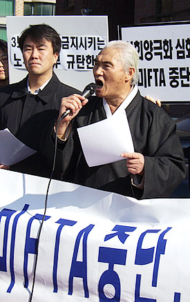 ▲11일 오전 11시 서울 청운동사무소 앞에서 한미FTA저지 범국본이 7차협상에 즈음한 기자회견을 가졌다. [사진-통일뉴스 정명진 기자]
