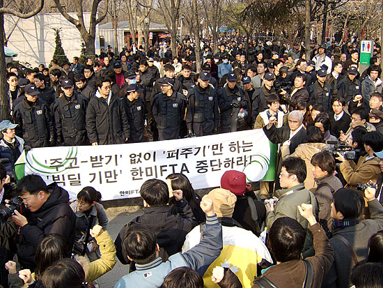 이날 정부는 '한미FTA반대'를 외치는 집회라면 방식을 불문하고 무조건 막아나서는 모습이었다.
