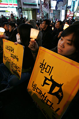 이들은 오후 9시10분 경 명동성당 길목에서 300여명이 모인 가운데 촛불집회를 진행했다. 전농 장동화 부의장은 "사선을 뚫고 전국 방방곡곡 이자리에 참석한 여러분들이 자랑스럽다"며 "우리 끝까지 싸워서 한미FTA 만큼은 기필코 막아내자"며 결의를 높였다.
