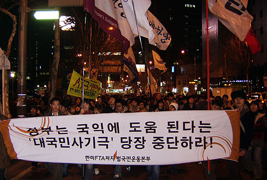 아울러 오후 8시경 동대문 운동장에서 횃불을 든 채 기습행진을 벌이고 명동으로 이동했다. 전국농민회총연맹은 "누차 요구해왔던 협상 중단의 요구를 묵살하고 외면한 채 이제 막바지에 치닫고 있는 상황에서 정부가 모든 것을 내어주는 협상을 진행할 것이 예상됨에 따라 망국적 협상을 전국의 350만 농민들이 반드시 막아내겠다는 결의로 진행한 것"이라고 밝혔다.