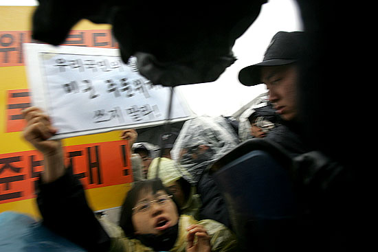국회 정문 앞에서 기자회견을 막으려는 경찰들과 '평통사'회원들과 실랑이가 벌어졌다. [사진-통일뉴스 김주영 기자]