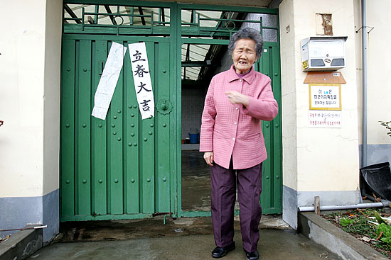 이순금 할머니가 지신밟기 행렬이 멀어지도록 문 앞을 지키고 있다. [사진-통일뉴스 김주영 기자]