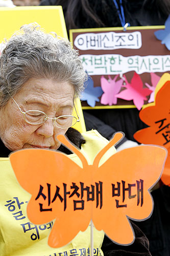 올해로 정대협 수요집회가 16년째를 맞은 가운데 751차 집회에 자리한 할머니의 표정이 결연하다.[사진-통일뉴스 김주영 기자]