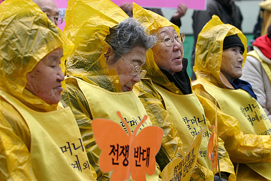'할머니들 눈에 피눈물'. 최근 아베 신조 일본 총리의 '위안부 증거없다'발언에 대해 피해 당사자들과 국제사회의 비난의 목소리가 연이은 가운데 21일 오전 11시 30분 주한일본대사관 앞에서 일본정부 규탄범시민집회가 열렸다. 사진은 집회 참가자들이 위안부 피해자 할머니들의 눈을 형상화한 피켓을 들고 있는 모습. [사진-통일뉴스 김주영 기자]