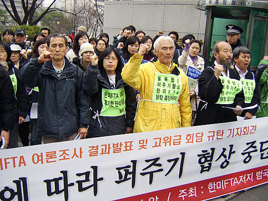 이에 따라, 50여 기자회견 참가자들은 "국민의 압도적 다수는 노무현 정부의 한미FTA 체결정책, 그것도 이번 3월말 안에 밀어붙여 타결한다는 체결일정에 대해 반대하고 있다"면서 "국민의 뜻을 배반하고 '묻지마 타결'로 돌진하고" 있는 정부를 성토했다.