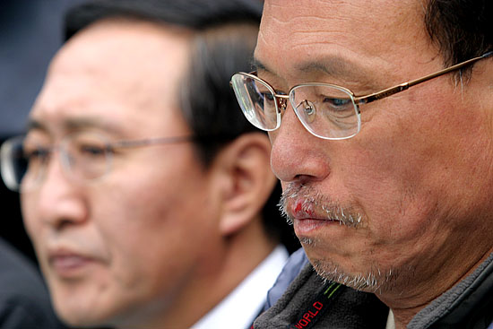 15일간 단식농성을 진행하면서 봄 볕에 그을린 문성현 대표의 얼굴이 이날 함께 자리한 의원들 사이에 있어 더욱 검게 보인다. [사진-통일뉴스 김주영 기자]
