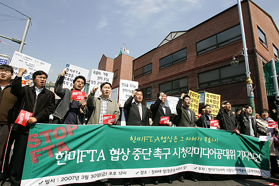 이날 기자회견 사회를 맡은 양문석 ‘한미FTA저지 시청각미디어공대위’정책위원장은 취재나온 기자들을 향해 “언론이 스스로 발등을 찍고 있다”며 한미FTA 실상에 대한 보도를 촉구했다.