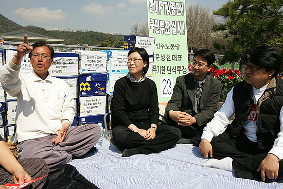 이 자리에서 단식농성을 진행 중인 문성현 민주노동당 대표는 “노무현 대통령이 협상을 타결시킨다면 비준을 넘어 정권에 대해 문제를 삼을 것”이라며 “타결선언 하면 바로 민주노동당은 대통령이 아니라고 말할 것”이라고 못 박았다.