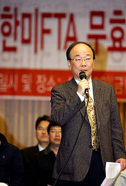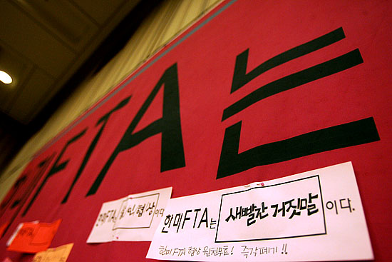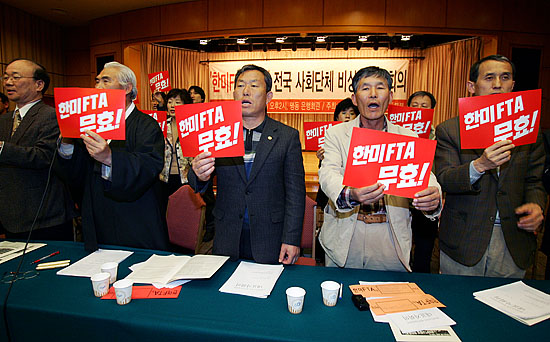 “정권의 핵심인사조차 정책 추진 자료에 접근하지도 못했고 한미FTA 추진의 유일한 근거자료조차 조작, 엉터리로 드러났다. 줄기찬 시민단체의 정보공개요구를 무시하고 시종일관 국민을 배제했으며 타결 이후에는 대통령이 반대론자들을 상대로 이념공세를 벌였다”고 지적하고 “한미FTA는 처음부터 끝까지 무효”라고 선언했다.