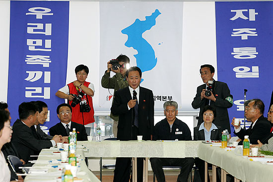 원형국 단장과 리충복 부위원장을 비롯한 북측 대표단은 경남본부 관계자들로부터 꽃다발을 받고 환영인파들이 외치는 "우리는 하나다" 함성 속에 계단을 이용, 3층 강당으로 올라갔다.
