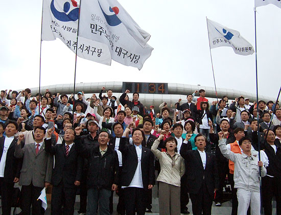 이날 오후 1시 30분 5.1절 남북노동자통일대회을 맞이하기 위한 민주노동당 결의대회에서 권영길 의원은 “노동자의 도시 창원에서 처음으로 북과 남의 노동자가 하나가 되었다”고 의미를 부여하고 “북과 남이 하나로 모인 이 자리에서 결의해야 할 것은 노동자들이 통일의 주체가 돼야 한다”고 강조했다.