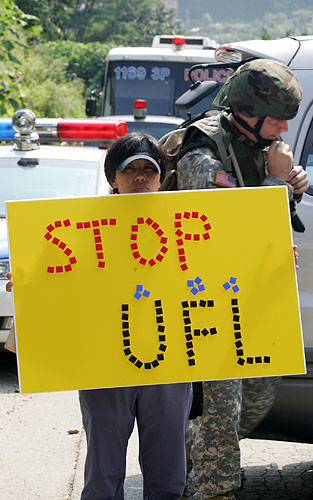 기지 안으로 들어서는 미군차량을 향해  항의피켓을 든 참가자. [사진-통일뉴스 김주영 기자]