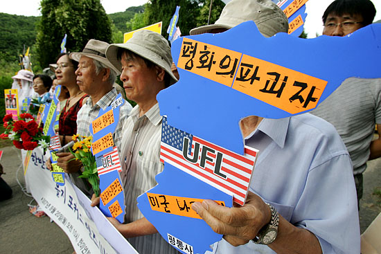 기자회견을 마친 참가자들이 UFL연습 반대 구호를 외치며 행진을 벌이고 있다. [사진-통일뉴스 김주영 기자]