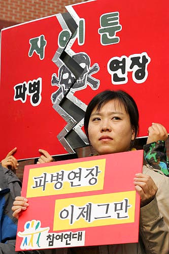 23일 오후2시 노무현 대통령의 자이툰 파병 연장 담화에 맞춰 '파병반대국민행동' 소속 단체 회원들이 서울 청와대 인근 청운동사무소 앞에서 '올해 안 철군 약속을 지킬 것'을 요구하며 기자회견을 열었다. [사진-통일뉴스 김주영 기자]