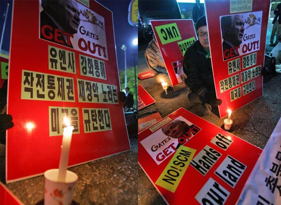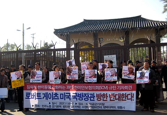 이날 오후 4시 24분께, 호텔 로비에 미리 대기하고 있던 평통사 회원 남성 2, 여성 1명은 게이츠 미 국방장관이 김장수 국방장관 초청 환영 리셉션에 참석하기 위해 신라호텔로 들어서는 순간 "Get Out Robert Gates", "Returne OPCON Right Now", "No SCM"이라고 적힌 플랜카드를 펼쳐들며 구호를 외쳤다.