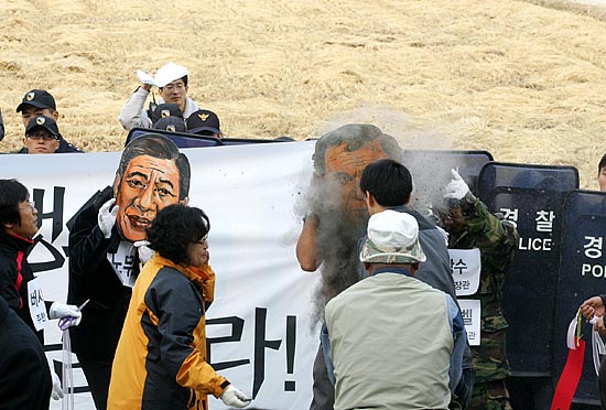 ▲주민들의 아픔을 형상화한 연극 도중 노무현 대통령과 부시 미 대통령으로 분한 단원들에게 재를 뿌리는 참가자들.[사진-통일뉴스 김주영 기자]