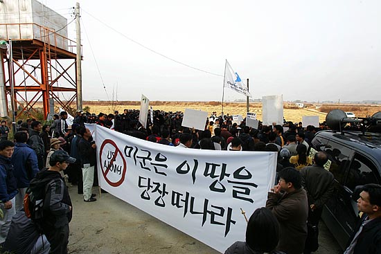 ▲ 13일 오후 2시 평택 팽성읍 대추리에서 주한미군기지 조성 기공식이 열리는 가운데 평택범대위 소속 회원들과 주민들이 규탄집회를 열었다. [사진-통일뉴스 김주영 기자]