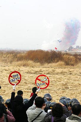 ▲축포가 터지는 기공식 현장을 향해 '미군기지확장반대'피켓을 든 참가자.  [사진-통일뉴스 김주영 기자]