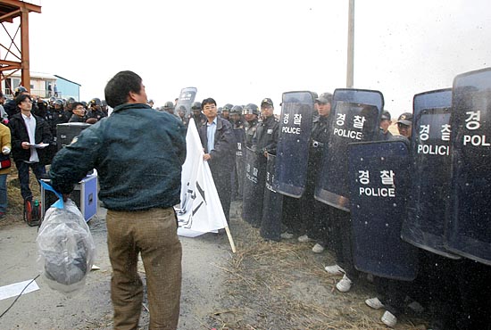 더욱이 전경들에 가로막혀, 논으로 들어가는 좁다란 길목에 빽빽히 들어 찬 참가자들은 멀리 대형 천막과 애드벌룬으로 보이는 기공식 현장을 바라보며 분통을 터뜨릴 수 밖에 없었다. 망연자실 담배를 피우던 한 주민은 전경들 뒤로 광활히 펼쳐져 있는 논을 가리키며 "여기서 뭐하는 거여. 저 넓은 땅 놔두고..."라며 탄식했다.