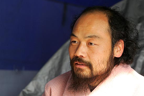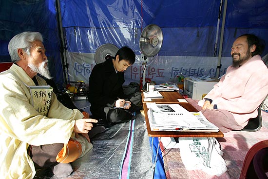 이 작가와 몇 마디 나누고 있자, 이내 천막안으로 낯익은 이가 들어섰다. 흰 수염에 삼베 옷을 입고 국회 앞 3보 1배에 함께 했던 오철근(59)씨. '비폭력평화물결'의 회원이라는 오 씨는 이 작가와 2003년 강화도에서 처음 만났다고.