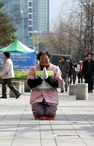 시민사회단체 회원들이 지난달 5일부터 23일까지 서울 여의도 국민은행 앞에서 17대 국회에서 국가보안법 폐지를 촉구하며 벌였던 3보 1배에 동참한 이시우 작가가 3일 홀연 단신 경기도 파주 임직각을 향했다. 배낭하나 메지 않고, 3보 1배로.