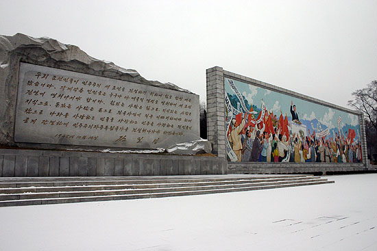 벽화 옆에는 605톤에 달하는 거대한 기념석에 당시 김 주석의 연설중 가장 유명한 ‘힘있는 사람은 힘으로, 지식있는 사람은 지식으로, 돈있는 사람은 돈으로 건국사업에 적극 이바지 하여야 하며...’라는 문구가 새겨져 있다.