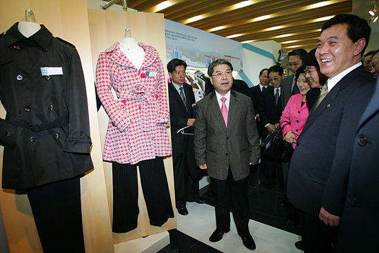 21일 개성공단에 위치한 남북경제협의사무소 새 청사의 준공식이 열린 가운데 남측 이재정 통일부 장관이 북측 권호웅 내각참사와 새 청사 1층에 마련된 개성공단 생산제품 전시관을 둘러보고 있다.[사진-인터넷사진공동취재단 김주영 기자]