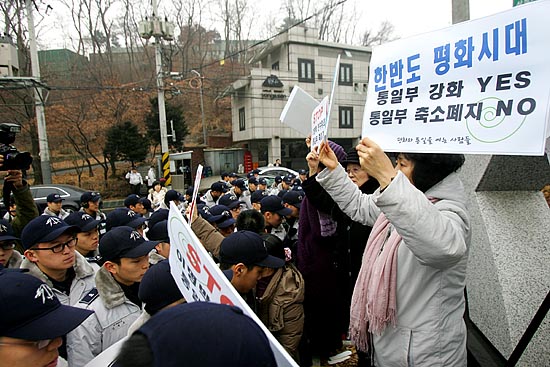 ▲통일부 인수위 업무보고가 열리는 7일 삼청동 인수위 앞에서 예정된 시민사회단체 회원들이 통일부 축소,폐지 방안 철회 촉구 가지회견'이 열리기 앞서 경찰에 둘러싸여 있다. [사진-통일뉴스 김주영 기자]