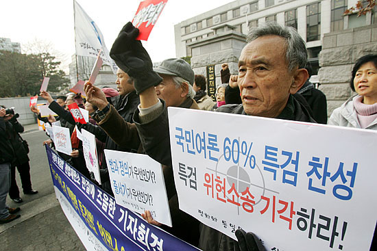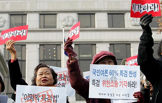 10일 '이명박 특검법' 위헌 심판 청구 선고가 예정된 가운데 9일 오전 '평화와통일을여는사람들' 소속 단체 회원들이 헌법재판소 앞에서 기자회견을 열고