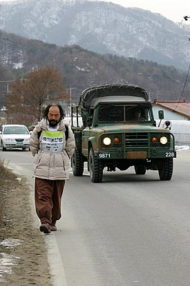 새벽 5시부터 저녁 7,8시까지 임진각에서 고성까지 휴전선을 따라, 이미 2004년에 ‘유엔사 해체 걷기 명상’을 펼쳤던 그 길 위에 그가 다시 찬바람을 맞으며 서있다.