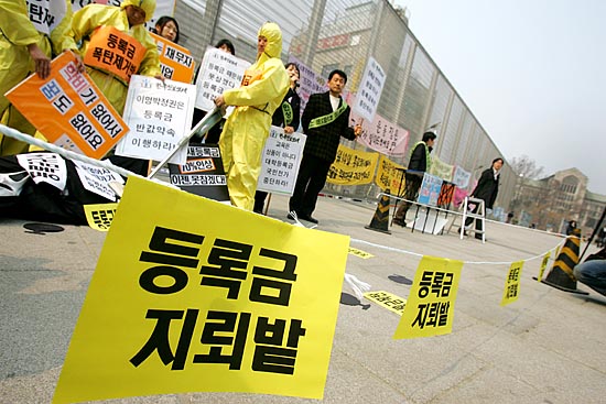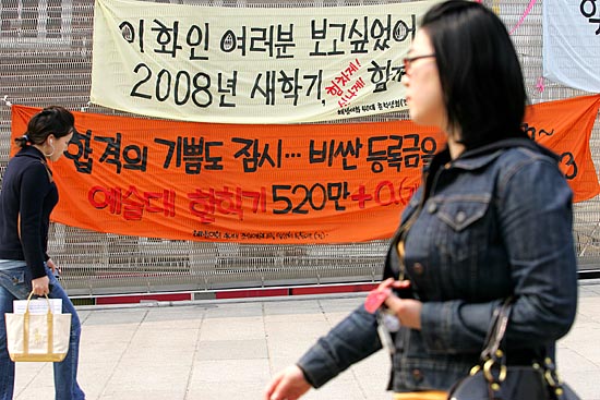 반면, 한 해 등록금 천만 원이 훌쩍 넘는 등록금을 인하할 것을 요구하는 현수막이 그 사이를 종횡무진 한다.