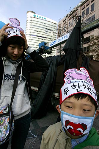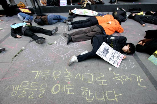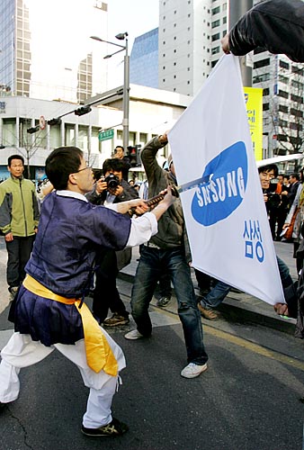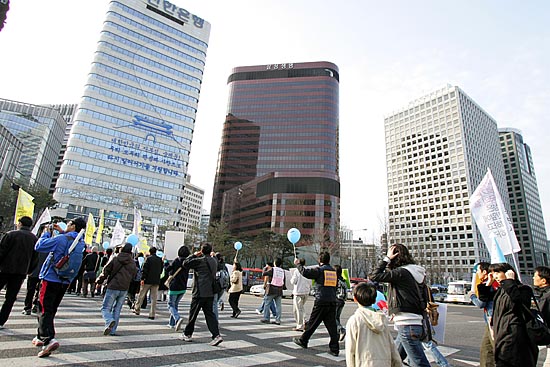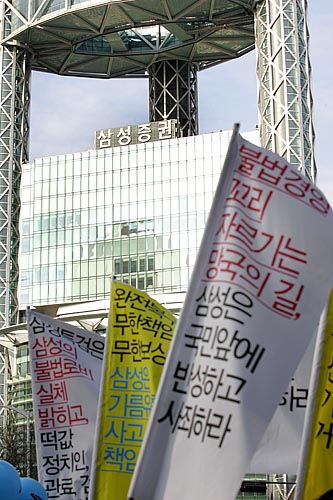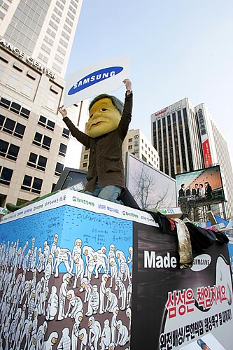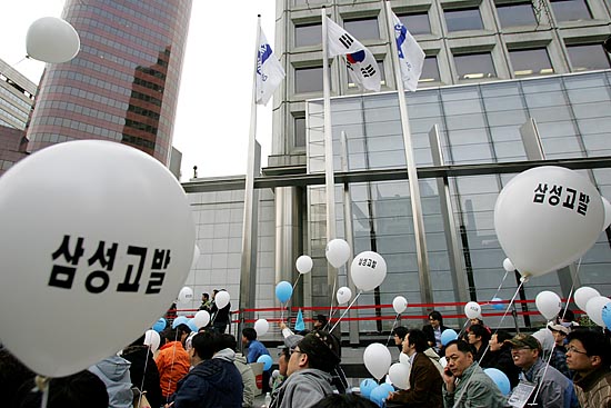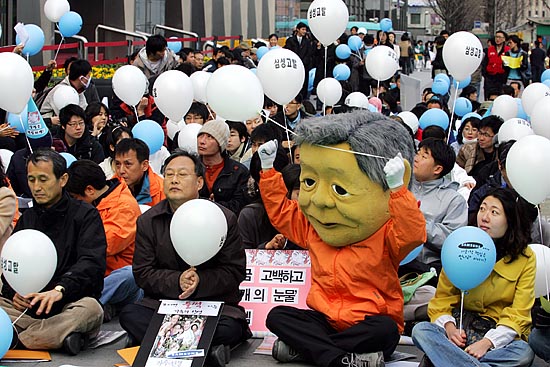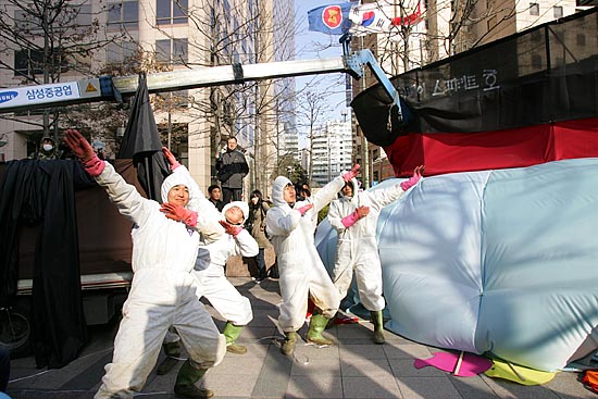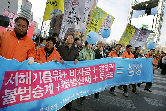 태안 기름유출 사고가 난지 100일째인 15일, 각계 시민단체 소속 회원 150여명은 ‘삼성의 사회적 책임을 촉구하는 국민한마당’을 개최하고 서울 청계광장을 시작해 명동을 거쳐 태평로 삼성 본관까지 행진을 벌이며 삼성의 책임을 촉구하는 행진과 퍼포먼스를 벌였다. 참가자들은 "삼성은 책임지세요" 등이 적힌 풍선과 각종 선전물을 들고 행진을 벌이며 삼성이 기름유출사고 뿐 아니라, 경영권 불법승계, 무노조 일관정책 등 삼성이 책임을 다할 것을 촉구했다. ▲태안 기름유출 사고가 난지 100일째인 15일, 각계 시민단체 소속 회원들이 태평로 삼성본관 앞에서 '삼성의 사회적 책임을 촉구하는 범국민 문화제'를 열었다. [사진-통일뉴스 김주영 기자]▲'반성하는(?)'. 참가자들 사이로 삼성 이건희 회장으로 분장한 한 참가자가 반성의 의미로 두 손을 번쩍 들고 있다. [사진-통일뉴스 김주영 기자]▲ 삼성본관 앞으로 가는 도중 종로타워 삼성증권 앞에 잠시 멈춰 선 참가자들. [사진-통일뉴스 김주영 기자]▲'기름유출, 비자금, 경영권 불법승계, 백혈병산재, 무노조=삼성'. 삼성증권을 지나 삼성 본관으로 행진을 벌이는 참가자들. [사진-통일뉴스 김주영 기자]▲'반성중(?)'. [사진-통일뉴스 김주영 기자]▲참가자들이 태안 기름유출사고로 파괴된 생태계를 상징하는 퍼포먼스를 벌였다. [사진-통일뉴스 김주영 기자]▲'삼성중공업, 무한책임'. [사진-통일뉴스 김주영 기자]▲태평로 삼성본관으로 향하는 참가자들. [사진-통일뉴스 김주영 기자]▲행진에 앞서 참가자들이 삼성의 기름유출사고와 자원봉사자들의 기름제거 작업을 형상화한 퍼포먼스를 벌여 시민들의 눈길을 끌었다. [사진-통일뉴스 김주영 기자]▲ '진검에 베이는 삼성'. 택견 시범자가 삼성 로고를 진검으로 베는 퍼포먼스를 벌였다. [사진-통일뉴스 김주영 기자]