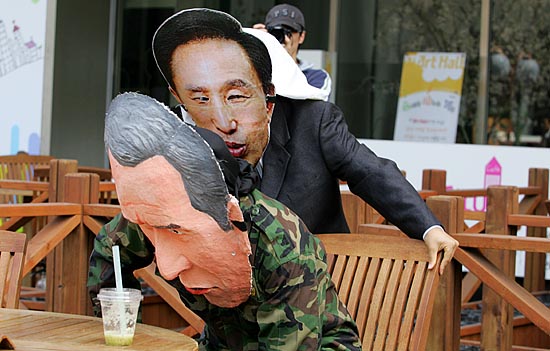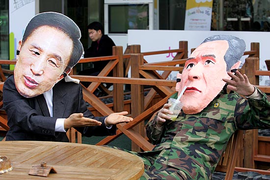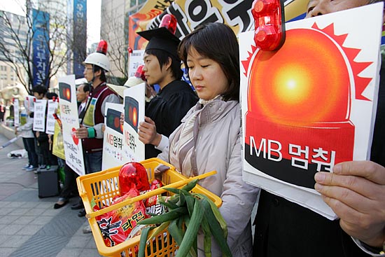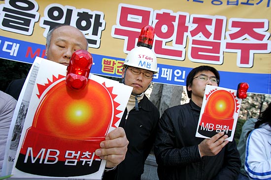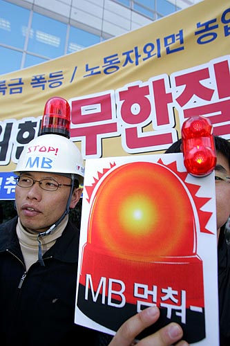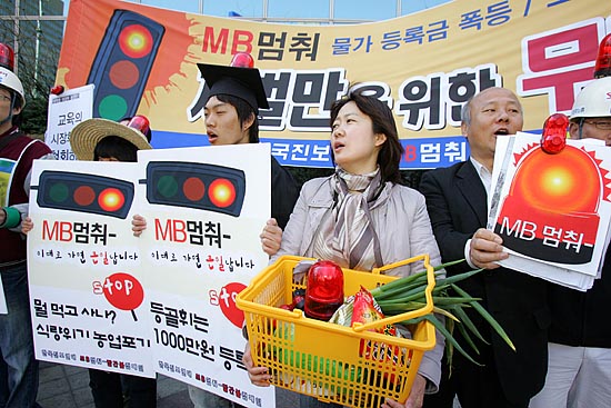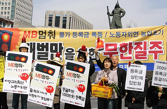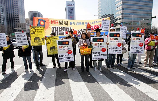 이명박 정부가 공식 출범한지 만 한달을 나흘 앞둔 21일, 시민사회단체들이 “새 정부 출범 직후부터 대학생들이 1000만원 등록금, 영어몰입교육으로 인한 사교육시장 팽창, 한반도대운하 강행 등 밀어붙이기 정책을 하고 있다”며 ‘빨간불’을 들고 나왔다. 이날 오전 11시 서울 광화문 사거리에서 ‘한국진보연대’ 소속 단체 회원들은 ‘MB 멈춰 빨간불 캠페인’을 벌이며 “이명박 정부가 추진하는 많은 정책방향이 서민들의 삶과 아이들의 장래를 암울하게 하고 있다”고 경고하고 나섰다. ▲ 21일 서울 광화문 사거리 횡단보도에서 '한국진보연대' 소속 단체 회원들이 이명박 정부의 비정규직 확산, 물가 폭등 등 '반서민적 정책'을 밀어붙이고 있다며 'MB 멈춰!' 퍼포먼스를 벌였다. [사진-통일뉴스 김주영 기자]▲'등록금 폭등, 물가 폭등, 비정규직 확산, 농업포기... MB 는 무한질주 중(?)'. [사진-통일뉴스 김주영 기자]▲ [사진-통일뉴스 김주영 기자]▲ 참가자들은 "사교육 광풍, 경제파탄, 대운하 무한질주' 등으로 이대로 가다가 큰 사고가 날 것"이라고 경고했다. [사진-통일뉴스 김주영 기자]▲'장바구니도 빨간불'. [사진-통일뉴스 김주영 기자]▲광화문 사거리 건널목을 건너는 시민들에게 'MB멈춰!' 퍼포먼스를 선보이는 참가자들. [사진-통일뉴스 김주영 기자]▲한편, 이날 낮12시 광화문 한국통신 앞에서 '한국진보연대' 단체 소속 회원들은 이명박 정부가 '묻지마 친미동맹'을 추진하고 있다며 이를 꼬집는 퍼포먼스를 벌였다. [사진-통일뉴스 김주영 기자]▲ 이명박 대통령과 부시 미 대통령으로 분한 참가자들이 '묻지마 한미동맹'을 꼬집는 익살맞은 퍼포먼스를 선보였다. [사진-통일뉴스 김주영 기자]
