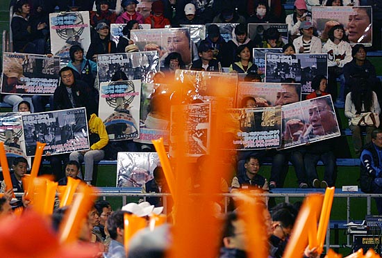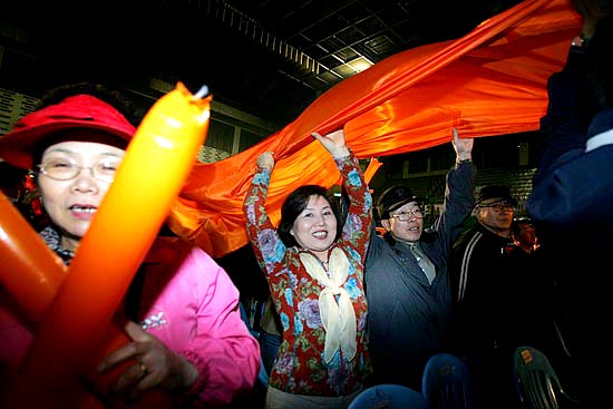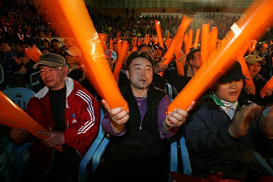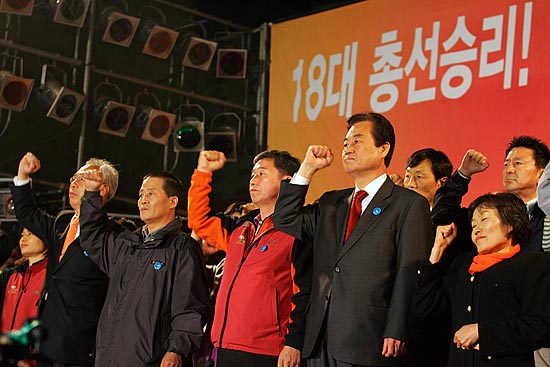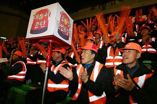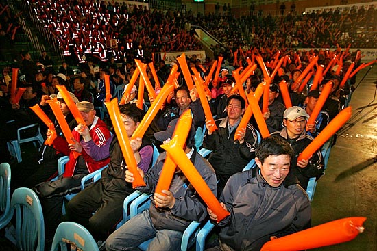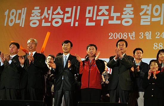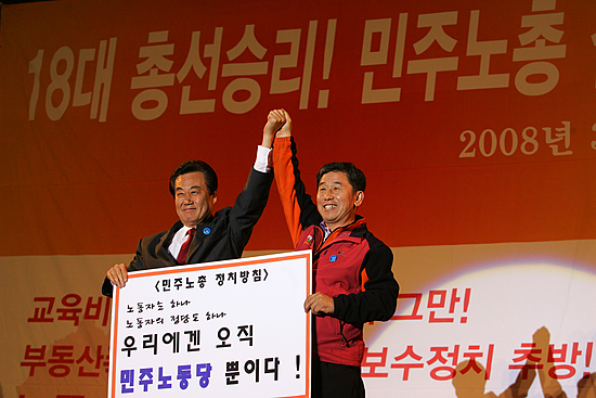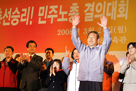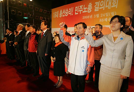 총선을 보름여 앞둔 24일 서울 등촌동 88체육관에서 민주노총 조합원 2천여 명과 민주노총 총선 출마자 15명이 참석해 ‘노동자 정치 세력화를 위한 18대 총선 결의대회’를 열고 노동자를 국회로 보낼 것을 다짐했다. ▲ '승리의 V'. '18대 총선 승리 민주노총 결의대회에 참가한 조합원들이 총선 출마자들을 응원하고 있다. [사진-통일뉴스 김주영 기자]▲ 환경미화원 노동자 전국민주연합노조 조합원들도 평소 '작업복'을 입고 등장해 눈길을 끌었다. [사진-통일뉴스 김주영 기자]▲ '노동자 진보정당'을 상징하는 주황색 현수막을 함께 들어올리는 조합원들. [사진-통일뉴스 김주영 기자]▲ 대회에 참가한 조합원들이 노동자 출신 후보들을 응원하고 있다. [사진-통일뉴스 김주영 기자]▲민주노동당 천영세 대표(왼쪽)와 민주노총 이석행 위원장(오른쪽)이 18대 총선에서 노동자의 정치세력화를 다짐하며 손을 맞잡았다. [사진-통일뉴스 김주영 기자]▲농민 출신이자 '전국농민회총연맹' 의장 출신인 문경식 후보가 조합원들에게 승리를 다짐하고 있다. [사진-통일뉴스 김주영 기자]▲'노동자를 국회로!'. [사진-통일뉴스 김주영 기자]▲'비정규직 문제 해결할 노동자 후보를 국회로...!'. 결의대회 한켠에는 여전히 해결되지 않은 비정규 노동자들의 상징 이랜드. 뉴코아 조합원들이 함께 했다. [사진-통일뉴스 김주영 기자]▲민주노동당과 민주노총 지도부를 비롯한 후보들이 함께 단상에 올랐다. [사진-통일뉴스 김주영 기자]▲단상에 오른 민주노동당 지도부와 총선 후보들이 '진보정당 승리'를 다짐하며 구호를 외치고 있다. [사진-통일뉴스 김주영 기자]▲ 단상에 오른 민주노동당 지도부와 총선 후보들이 '진보정당 승리'를 다짐하며 구호를 외치고 있다. [사진-통일뉴스 김주영 기자]