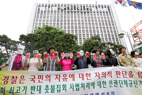 인권단체들은 박옥순 장애와인권발바닥 행동 상임활동가가 발표한 기자회견문을 통해 "촛불문화제는 국민의 정당한 저항권 행사"라며 "정부는 민심의 소리를 불법으로 몰아 사법처리 하겠다고 으름장을 놓고 있다"고 규탄했다.