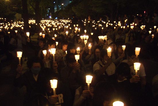오후 8시, 여의도 공원 인근 산업은행 앞은 6천여 명의 시민들로 북적였다. 시간이 지나면서, 시민들의 촛불은 더욱 늘어났고, 오후 9시 즈음 1만여 개의 촛불이 소리없이 타고 있었다.