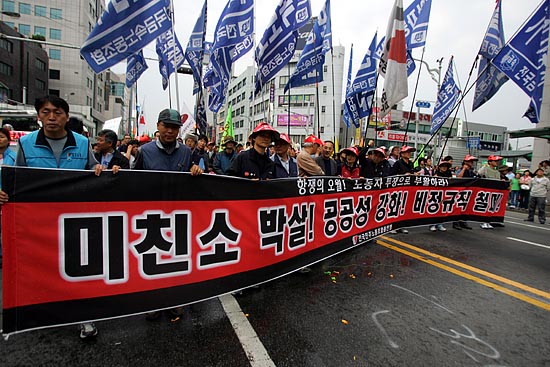 노동자들은 '광우병 쇠고기 수입반대','의료보험민영화 저지'등의 구호가 적힌 깃발을 들고 금남로 거리 행진에 참가했다. [사진-통일뉴스 조성봉 기자]