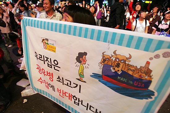 민주노총은 '광우병 쇠고기' 수입 반대를 형상화한 조형물을 끌고 거리행진을 했다.[사진-통일뉴스 조성봉 기자]