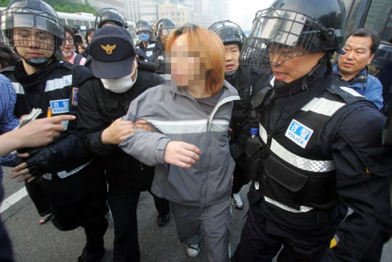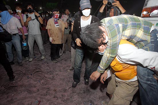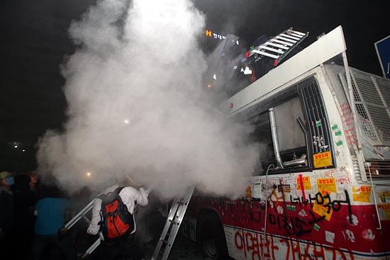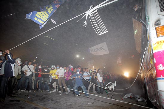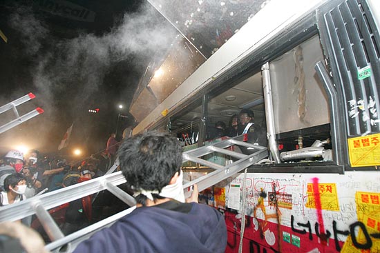 이어 5명의 시민들이 경찰차량 위로 뛰어들어 경찰차량 위에 부착된 바리케이트를 발로 차 부숴버리자, 경찰 측은 전경들을 투입해 시민들을 경찰차량 밑으로 밀어냈다.