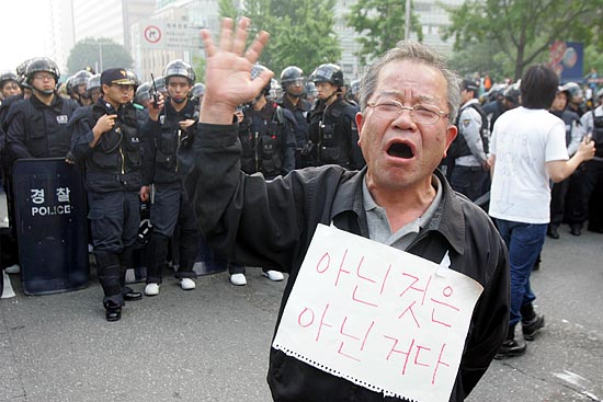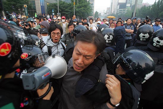 시민들은 경찰차량 위로 올라가는 등 보다 적극적인 방법으로 '재협상'의 의지를 표현했다. 경찰 측은 무리한 대응을 하지 않고 경찰차량으로 올라온 시민들을 설득하는 방법으로 시민들을 진정시키려고 했지만, 연일 20만 촛불로 뜨거워진 '민심'을 식히기에는 힘겨워 보였다.