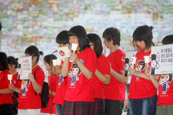 이날 오전 영결식에서 추모글을 낭독했던 황금령(15)양과 교복을 차려입은 중.고등학생 20여명이 무대에 올라 '이병렬' 씨를 추모하며 '광야에서'를 합창했고 3만여 시민들도 촛불을 흔들며 따라 불렀다.